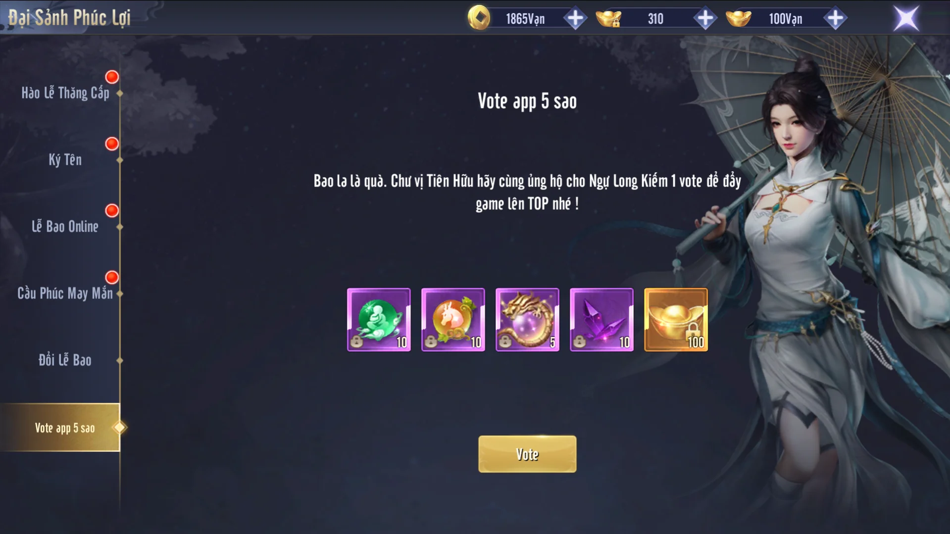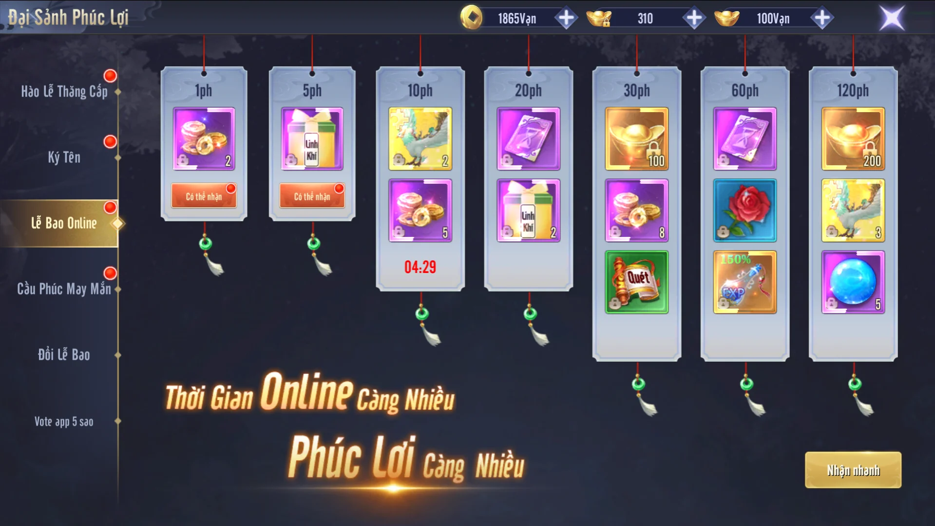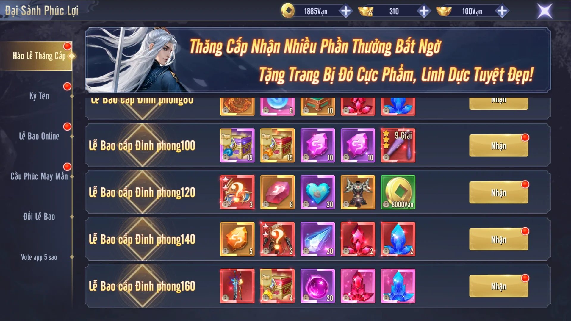 Hệ thống phúc lợi vô cùng đặc sắc trong Phong Vân Kiếm Origin. Khi Đại Hiệp đạt đủ cấp độ yêu cầu sẽ nhận được, vô cùng nhiều phần quà giá trị để bạn trải nghiệm như: