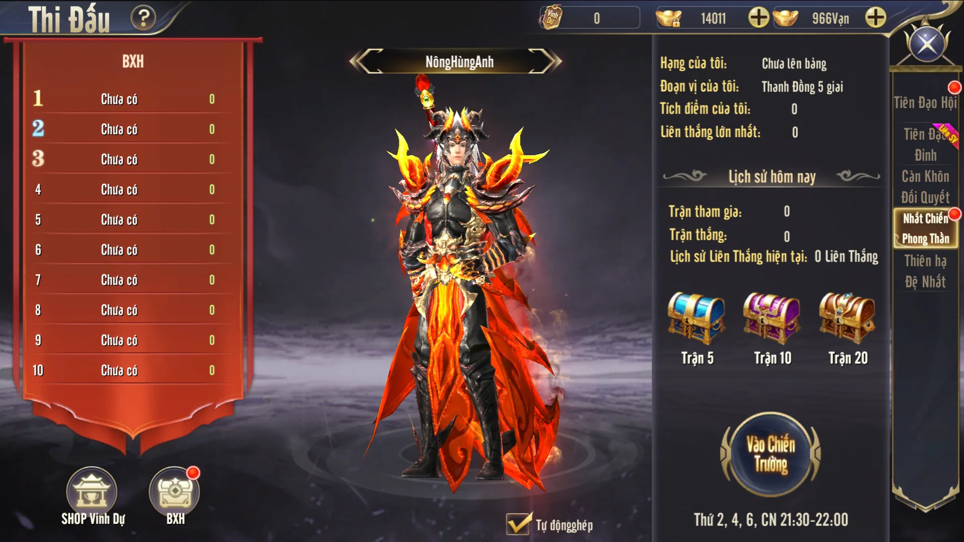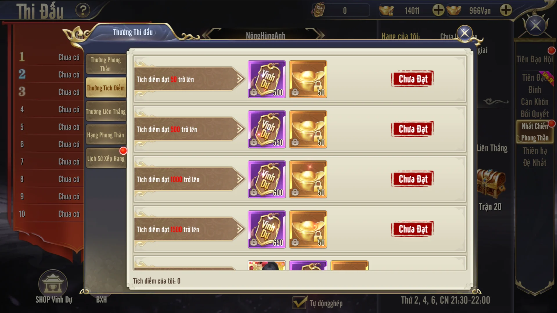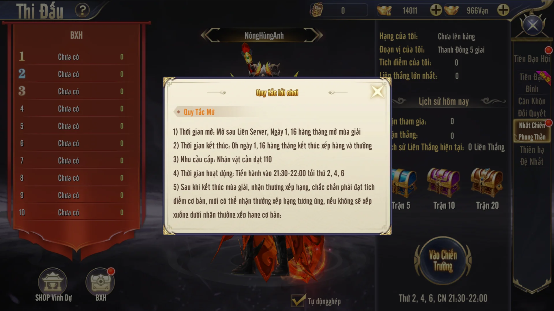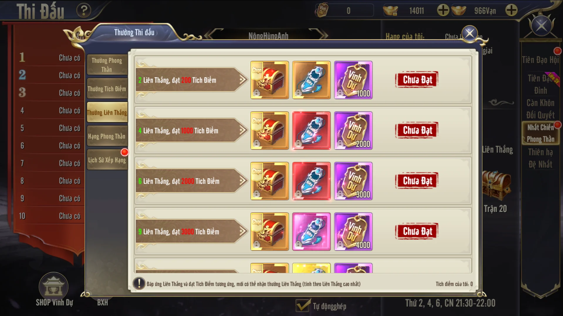 - Trong thời gian hoạt động không giới hạn số lượt khiêu chiến, nhưng chỉ có 10 trận đầu mới được nhận thưởng và exp, số lượt khiêu chiến sau sẽ chỉ tăng tích điểm