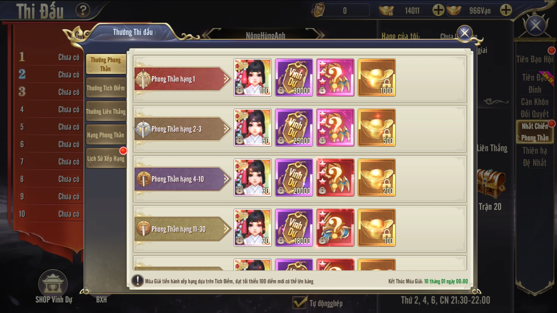 - Thời gian kết thúc: 0h ngày 1, 16 hàng tháng – kết thúc xếp hạng và tổng kết thưởng