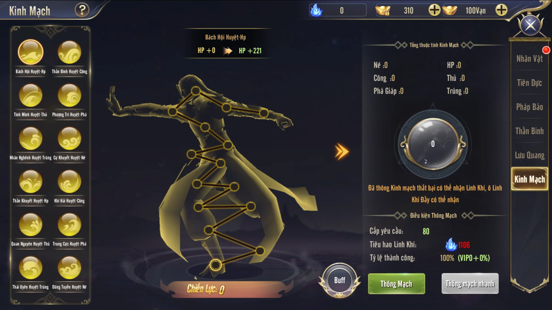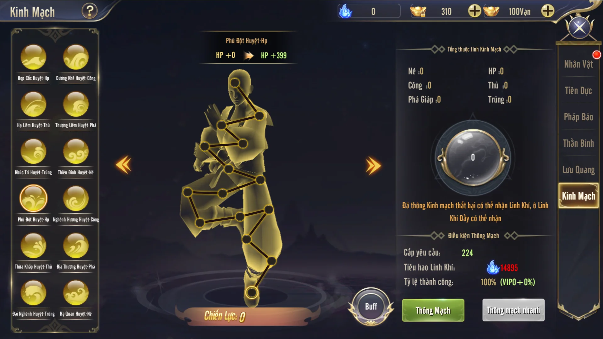 - Kinh Mạch càng cao thì buff càng nhiều chỉ số cơ bản, giúp nhân vật mạnh mẽ hơn qua mỗi giai đoạn.