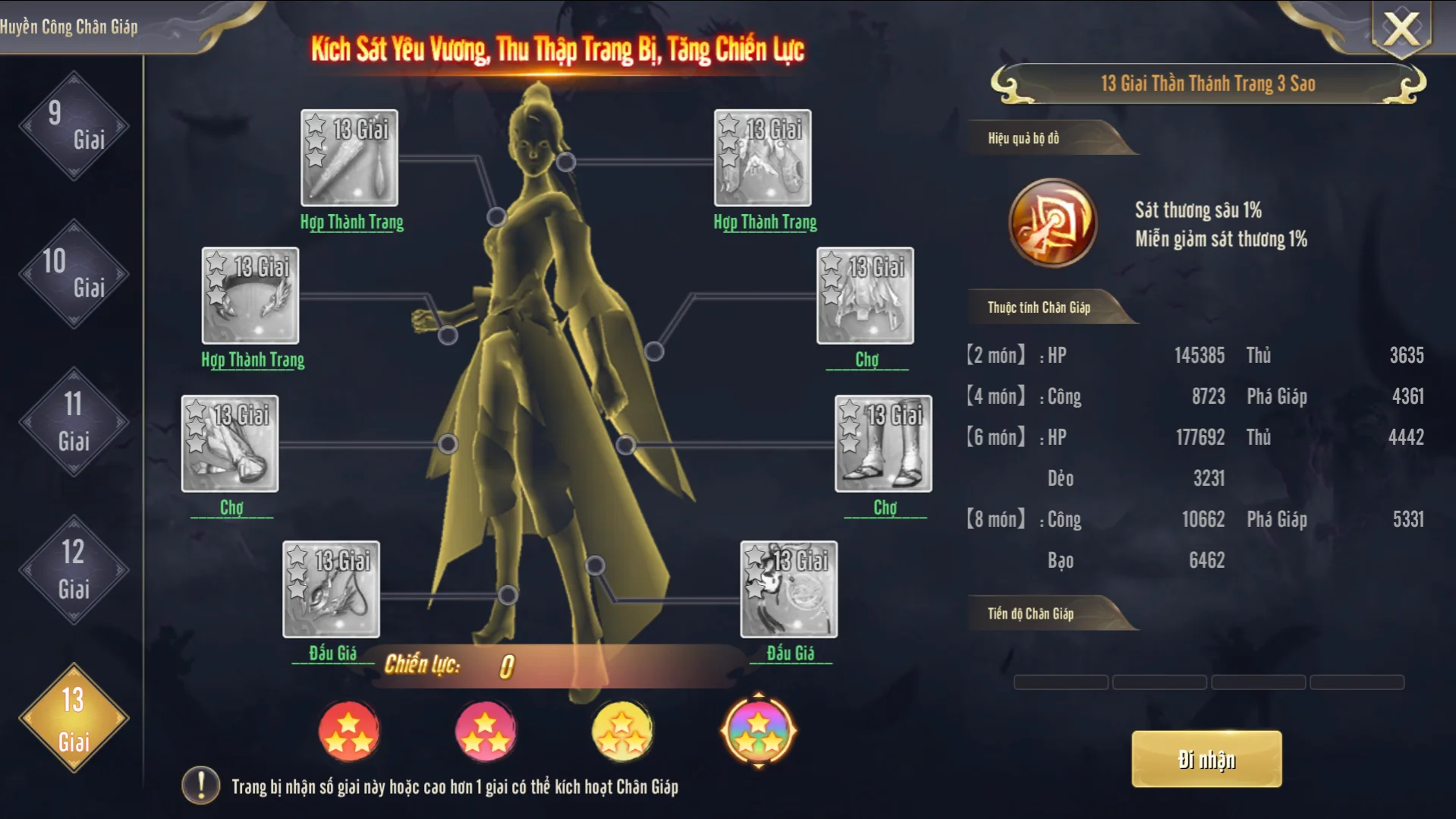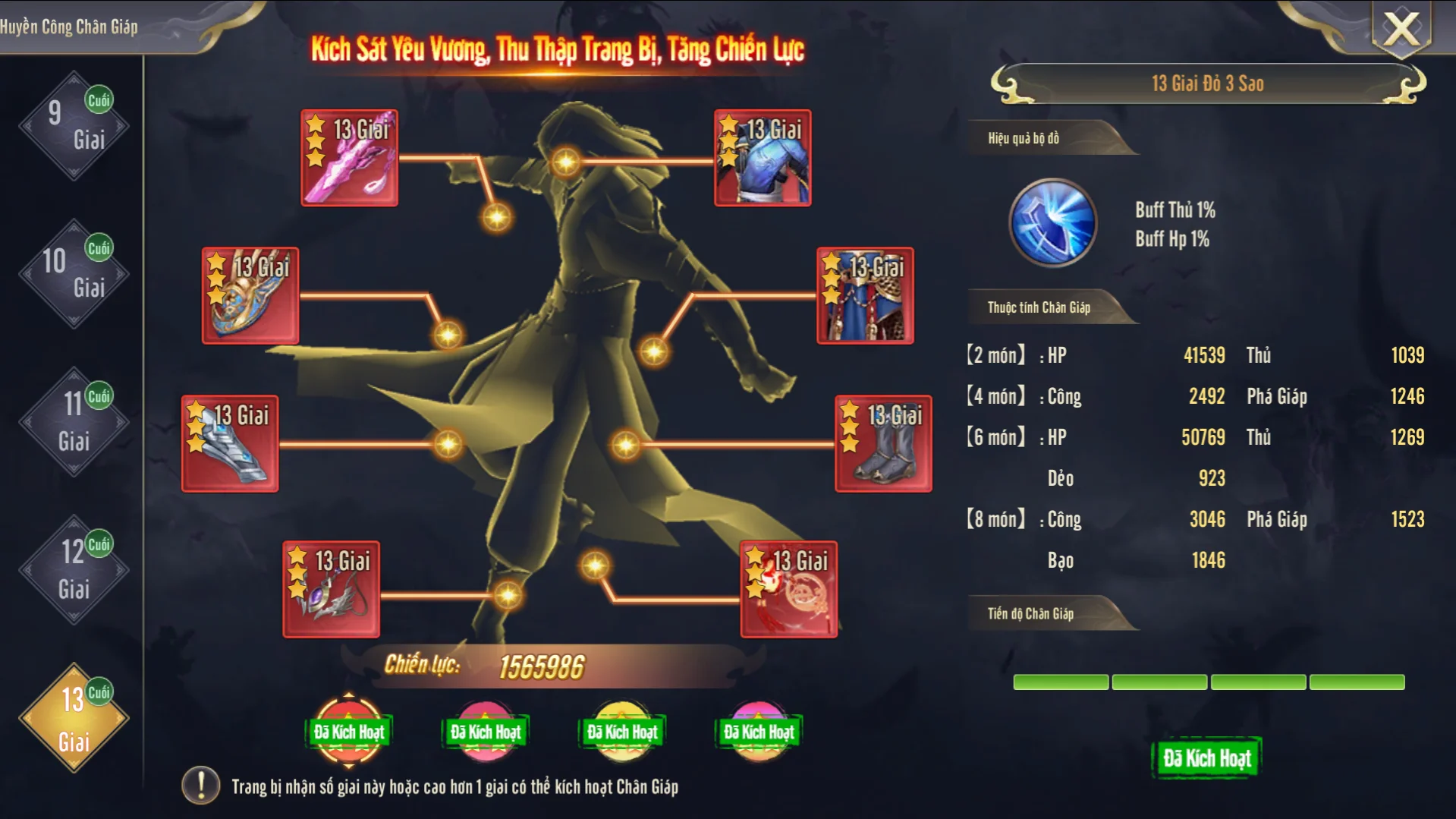 - Khi thu thập đủ set trang bị theo giai, Đại Hiệp sẽ nhận được rất nhiều thuộc tính cơ bản và các dòng % thuộc tính mạnh như: Thủ, HP, Công, Giảm Sát Thương, Phá Giáp, Sát Thương Kỹ Năng...