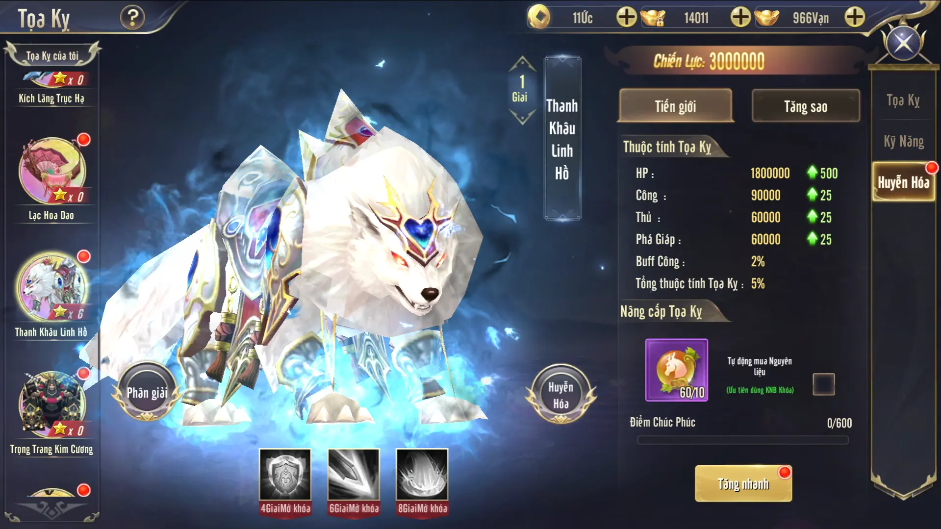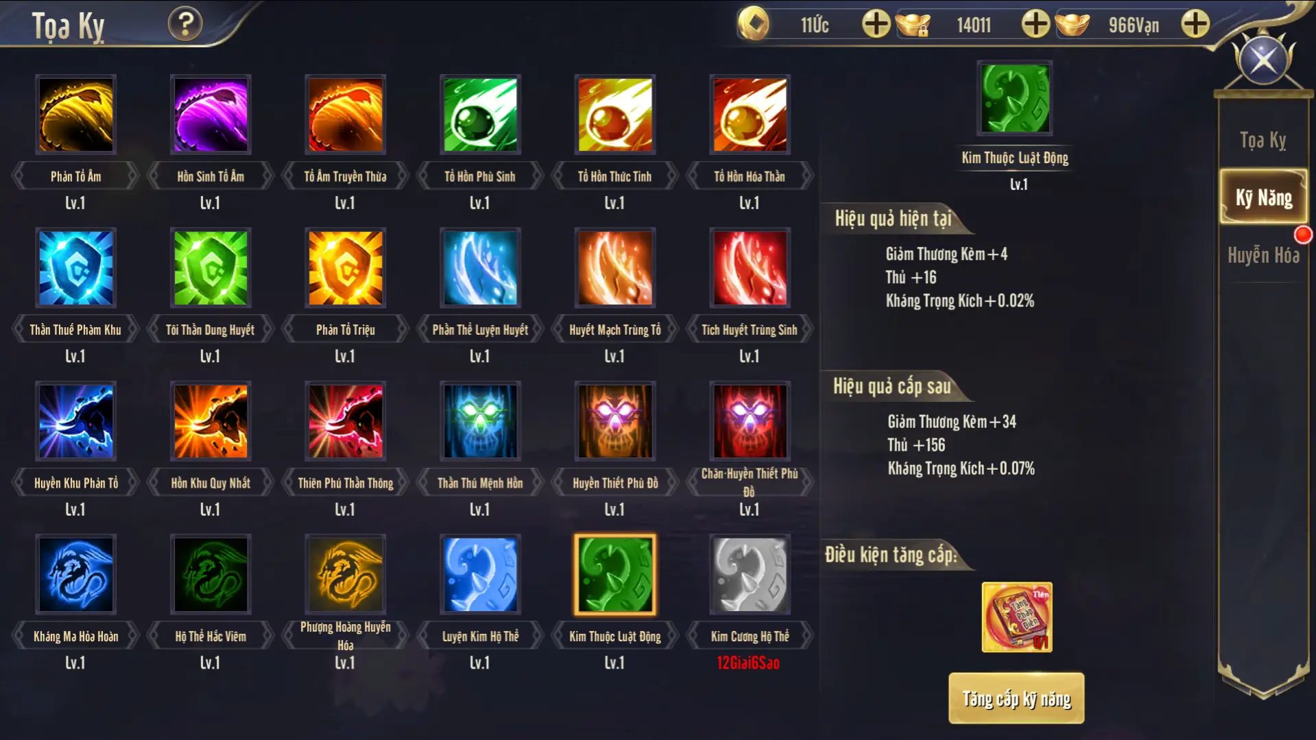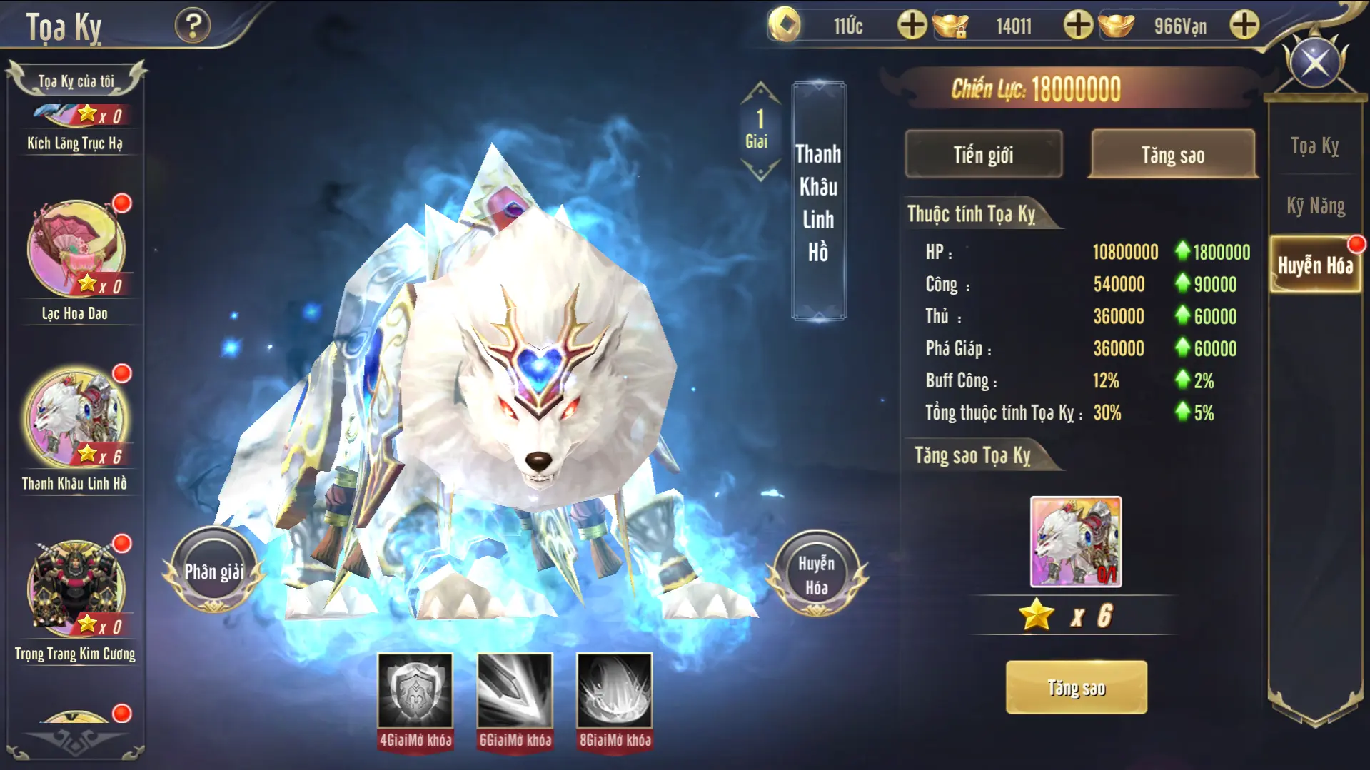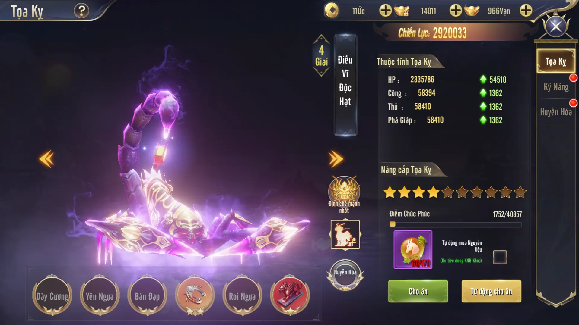 - Tọa Kỵ có tổng tới 36 skill để người chơi có thể cộng gia tăng thuộc tính và lực chiến cực khủng